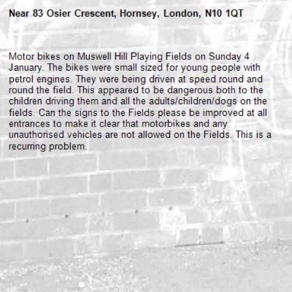 Motor bikes on Muswell Hill Playing Fields on Sunday 4 January. The bikes were small sized for young people with petrol engines. They were being driven at speed round and round the field. This appeared to be dangerous both to the children driving them and all the adults/children/dogs on the fields. Can the signs to the Fields please be improved at all entrances to make it clear that motorbikes and any unauthorised vehicles are not allowed on the Fields. This is a recurring problem.