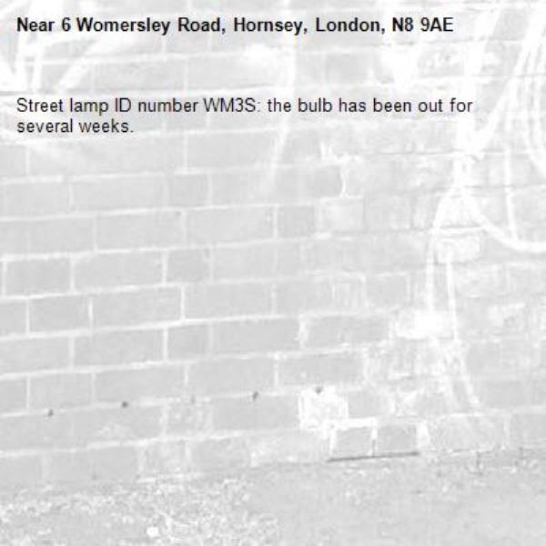 Street lamp ID number WM3S: the bulb has been out for several weeks.