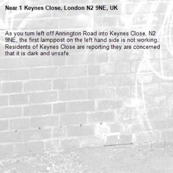 As you turn left off Annington Road into Keynes Close, N2 9NE, the first lamppost on the left hand side is not working. Residents of Keynes Close are reporting they are concerned that it is dark and unsafe.