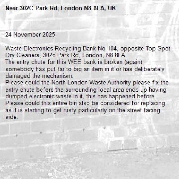 24 November 2025<br/><br/>Waste Electronics Recycling Bank No 104, opposite Top Spot Dry Cleaners, 302c Park Rd, London, N8 8LA<br/>The entry chute for this WEE bank is broken (again), somebody has put far to big an item in it or has deliberately damaged the mechanism.<br/>Please could the North London Waste Authority please fix the entry chute before the surrounding local area ends up having dumped electronic waste in it, this has happened before. Please could this entire bin also be considered for replacing as it is starting to get rusty particularly on the street facing side.