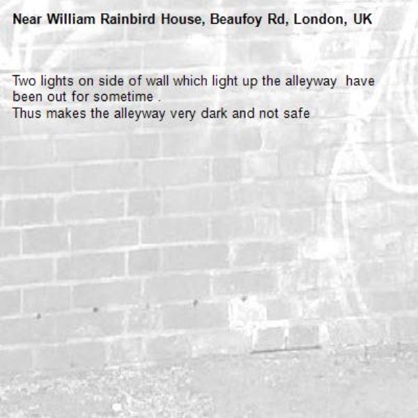 Two lights on side of wall which light up the alleyway have been out for sometime .<br/>Thus makes the alleyway very dark and not safe