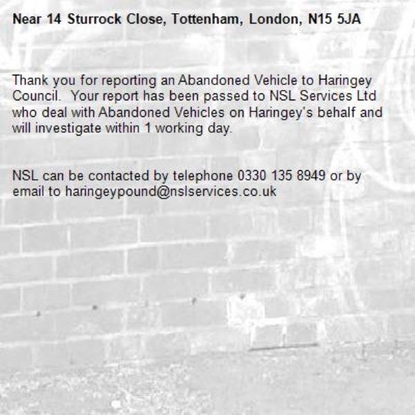 I am writing to report an abandoned vehicle that is causing significant issues for residents on Ida/Sturrock Close N15 5JA, A small van Reg number NU64HLK has been parked continuously in the same place for more than 9 months. It shows clear signs of abandonment, and does not display a valid Paking permit The lack of available parking has become a persistent problem for us. Could you please deal with it.