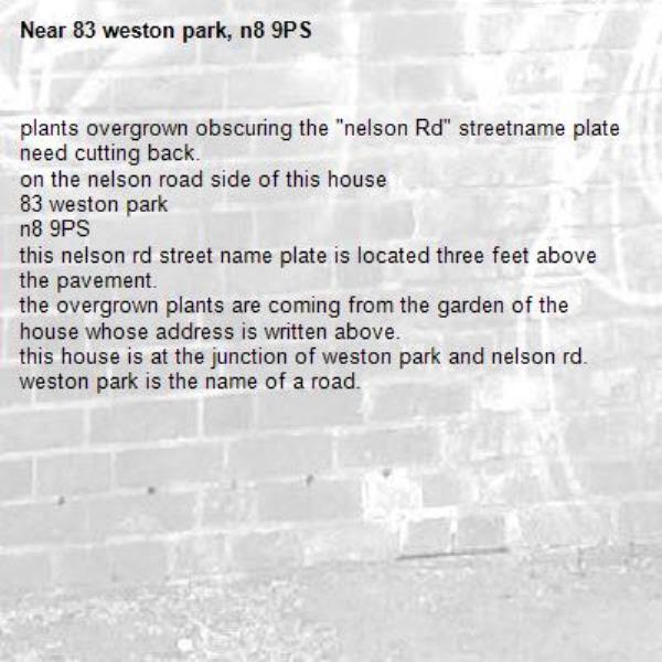 plants overgrown obscuring the "nelson Rd" streetname plate need cutting back.<br/>on the nelson road side of this house<br/>83 weston park<br/>n8 9PS<br/>this nelson rd street name plate is located three feet above the pavement.<br/>the overgrown plants are coming from the garden of the house whose address is written above.<br/>this house is at the junction of weston park and nelson rd. weston park is the name of a road.<br/>