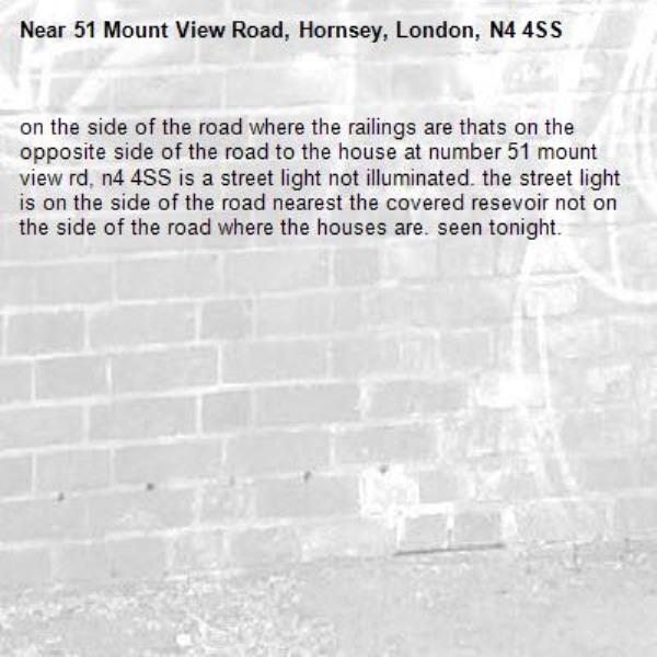 on the side of the road where the railings are thats on the opposite side of the road to the house at number 51 mount view rd, n4 4SS is a street light not illuminated. the street light is on the side of the road nearest the covered resevoir not on the side of the road where the houses are. seen tonight.