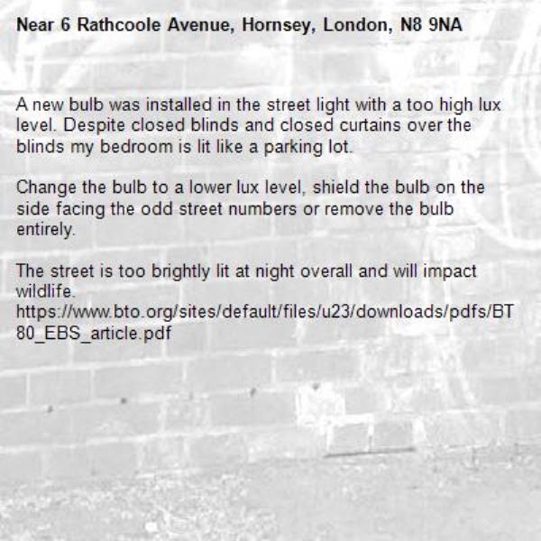 A new bulb was installed in the street light with a too high lux level. Despite closed blinds and closed curtains over the blinds my bedroom is lit like a parking lot.<br/><br/>Change the bulb to a lower lux level, shield the bulb on the side facing the odd street numbers or remove the bulb entirely.<br/><br/>The street is too brightly lit at night overall and will impact wildlife. https://www.bto.org/sites/default/files/u23/downloads/pdfs/BT80_EBS_article.pdf
