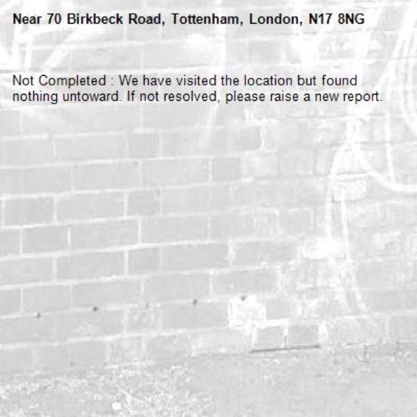 -70 Birkbeck Road, Tottenham, London, N17 8NG 16/03/2026 08:01 Not Completed : We have visited the location but found nothing untoward. If not resolved, please raise a new report.