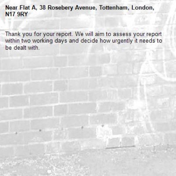 Thank you for your report. We will aim to assess your report within two working days and decide how urgently it needs to be dealt with.-Flat A, 38 Rosebery Avenue, Tottenham, London, N17 9RY 14/04/2026 19:48 Thank you for your report. We will aim to assess your report within two working days and decide how urgently it needs to be dealt with.