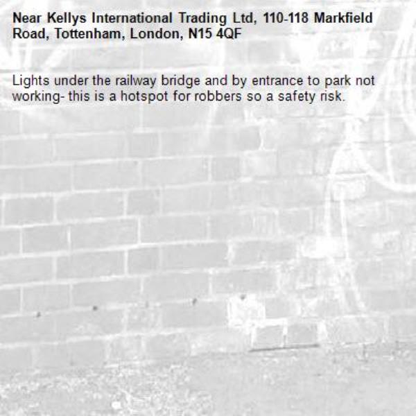 Lights under the railway bridge and by entrance to park not working- this is a hotspot for robbers so a safety risk.