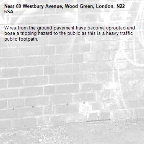 Wires from the ground pavement have become uprooted and pose a tripping hazard to the public as this is a heavy traffic public footpath.