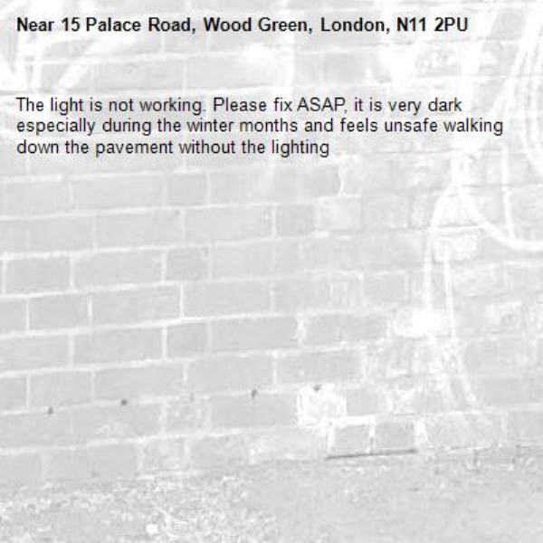The light is not working. Please fix ASAP, it is very dark especially during the winter months and feels unsafe walking down the pavement without the lighting