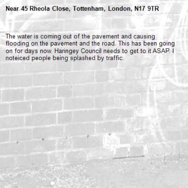 The water is coming out of the pavement and causing flooding on the pavement and the road. This has been going on for days now. Haringey Council needs to get to it ASAP. I noteiced people being splashed by traffic.