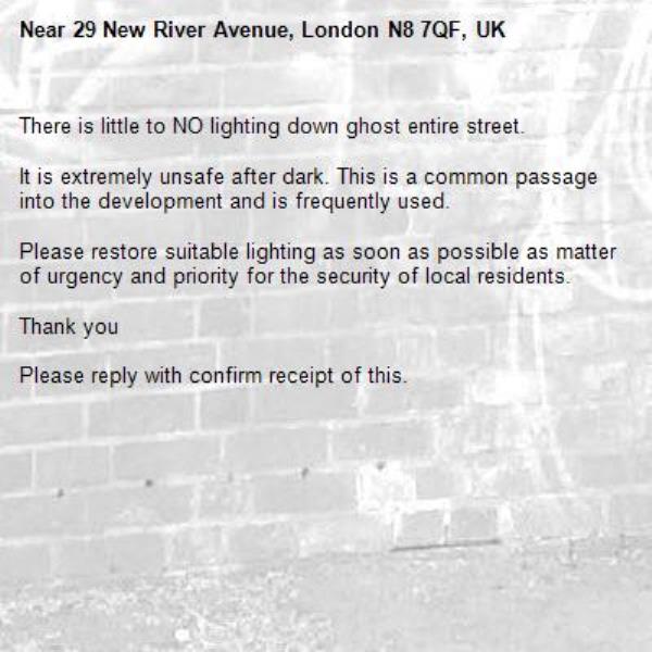 There is little to NO lighting down ghost entire street.<br/><br/>It is extremely unsafe after dark. This is a common passage into the development and is frequently used.<br/><br/>Please restore suitable lighting as soon as possible as matter of urgency and priority for the security of local residents. <br/><br/>Thank you<br/><br/>Please reply with confirm receipt of this.