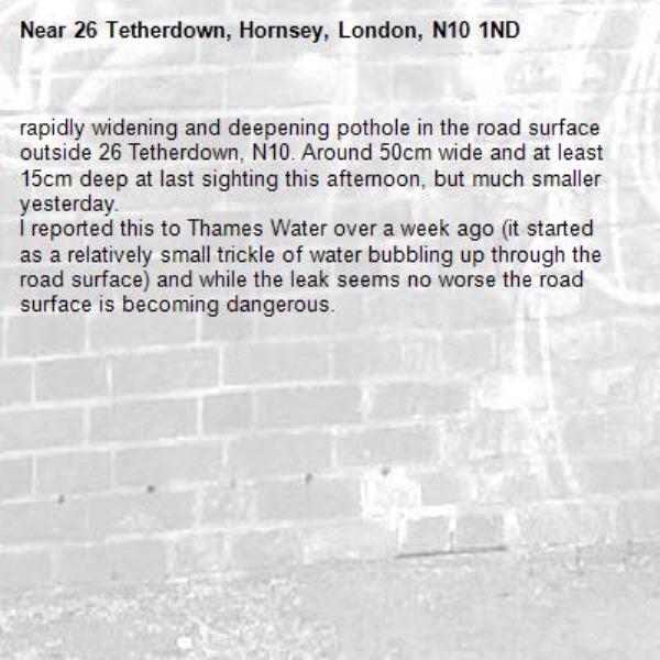 rapidly widening and deepening pothole in the road surface outside 26 Tetherdown, N10. Around 50cm wide and at least 15cm deep at last sighting this afternoon, but much smaller yesterday.<br/>I reported this to Thames Water over a week ago (it started as a relatively small trickle of water bubbling up through the road surface) and while the leak seems no worse the road surface is becoming dangerous.
