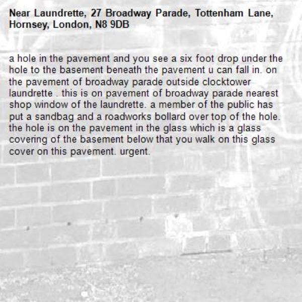 a hole in the pavement and you see a six foot drop under the hole to the basement beneath the pavement u can fall in. on the pavement of broadway parade outside clocktower laundrette . this is on pavement of broadway parade nearest shop window of the laundrette. a member of the public has put a sandbag and a roadworks bollard over top of the hole. the hole is on the pavement in the glass which is a glass covering of the basement below that you walk on this glass cover on this pavement. urgent.
