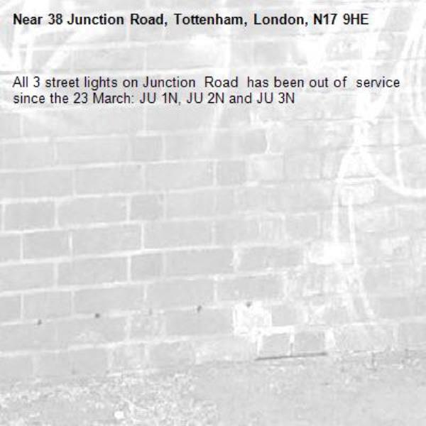 All 3 street lights on Junction Road has been out of service since the 23 March: JU 1N, JU 2N and JU 3N