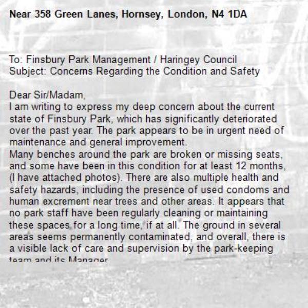 To: Finsbury Park Management / Haringey Council<br/>Subject: Concerns Regarding the Condition and Safety<br/><br/>Dear Sir/Madam,<br/>I am writing to express my deep concern about the current state of Finsbury Park, which has significantly deteriorated over the past year. The park appears to be in urgent need of maintenance and general improvement.<br/>Many benches around the park are broken or missing seats, and some have been in this condition for at least 12 months, (I have attached photos). There are also multiple health and safety hazards, including the presence of used condoms and human excrement near trees and other areas. It appears that no park staff have been regularly cleaning or maintaining these spaces for a long time, if at all. The ground in several areas seems permanently contaminated, and overall, there is a visible lack of care and supervision by the park-keeping team and its Manager.<br/>Another serious concern is the growing number of tents in the park. While I have genuine empathy for those who are truly homeless, I have spoken with some individuals who appear to be living there to save money rather than out of necessity. Around these tents, there is an alarming amount of rubbish, human waste, and even cooking setups that have caused damage to the ground. I have attached photos for your reference, in case management is not fully aware of the situation.<br/>Two-three years ago there were around 6 tents; now there are more than 20. This shows that the problem is worsening and needs a clear plan of action from the council or park management.<br/>In addition, the park is lacking sufficient bins. Many broken bins have been removed but not replaced, and there are very few new ones provided. This has led to widespread littering, especially by picnic-goers, drinkers, and others who leave bottles and packaging behind. At the very least, there should be a bin placed by all park entrances/exits gate to encourage visitors to dispose of their rubbish properly.<br/>The children’s play areas also require urgent attention. There are broken railings, damaged flooring, and out-of-use benches that have remained unrepaired for months. These are serious safety risks for families who continue to use these spaces.<br/>Finsbury Park has always been a favourite place for my family and friends, but sadly, it no longer feels safe or cared for. It looks increasingly neglected and abandoned.<br/>Before closing this letter, I would like to acknowledge two gentlemen who usually look after the Mackenzie Garden area. They are always polite, hard-working, and clearly take pride in what they do. Although I do not know their names, I believe their efforts deserve recognition, as they are one of the few positive aspects of the park’s current condition.<br/>It is worth mentioning that a very good example can be seen in Clissold Park, which is not far from the area. The management and park team there clearly take pride in maintaining the park to a high standard. They regularly repair or replace broken play equipment, promptly fix or replace bins, and frequently install new benches to improve the environment. If Hackney Council can achieve and maintain such standards, I do not see why Finsbury Park cannot receive the same level of care and attention.<br/>I hope the management and council will take these concerns seriously and take immediate action to restore Finsbury Park to the clean, welcoming space it once was.<br/><br/>Yours faithfully,