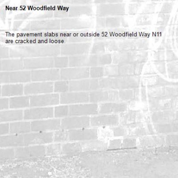 The pavement slabs near or outside 52 Woodfield Way N11 are cracked and loose.