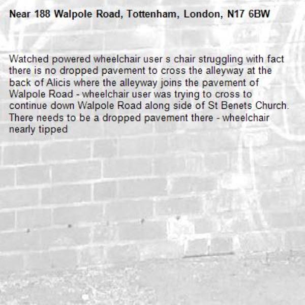 Watched powered wheelchair user s chair struggling with fact there is no dropped pavement to cross the alleyway at the back of Alicis where the alleyway joins the pavement of Walpole Road - wheelchair user was trying to cross to continue down Walpole Road along side of St Benets Church. There needs to be a dropped pavement there - wheelchair nearly tipped