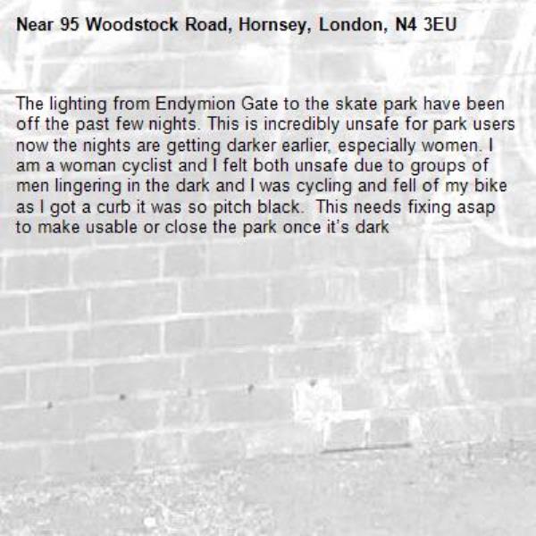 The lighting from Endymion Gate to the skate park have been off the past few nights. This is incredibly unsafe for park users now the nights are getting darker earlier, especially women. I am a woman cyclist and I felt both unsafe due to groups of men lingering in the dark and I was cycling and fell of my bike as I got a curb it was so pitch black. This needs fixing asap to make usable or close the park once it’s dark