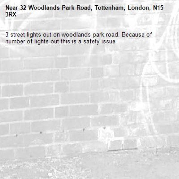 3 street lights out on woodlands park road. Because of number of lights out this is a safety issue