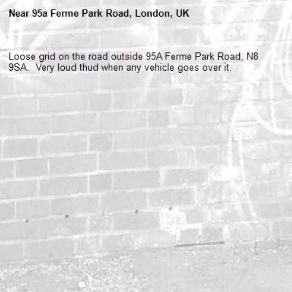 Loose grid on the road outside 95A Ferme Park Road, N8 9SA. Very loud thud when any vehicle goes over it.
