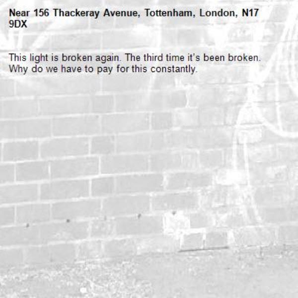 This light is broken again. The third time it’s been broken. Why do we have to pay for this constantly.
