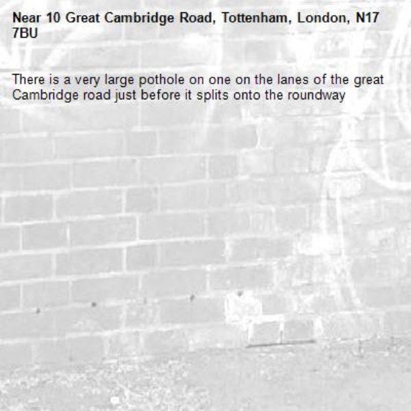 There is a very large pothole on one on the lanes of the great Cambridge road just before it splits onto the roundway