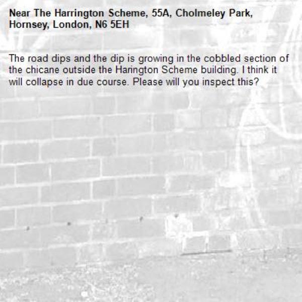 The road dips and the dip is growing in the cobbled section of the chicane outside the Harington Scheme building. I think it will collapse in due course. Please will you inspect this?