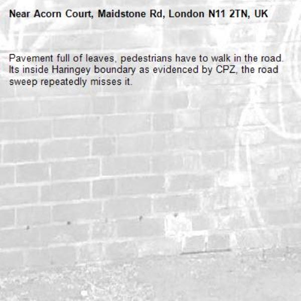 Pavement full of leaves, pedestrians have to walk in the road. Its inside Haringey boundary as evidenced by CPZ, the road sweep repeatedly misses it.
