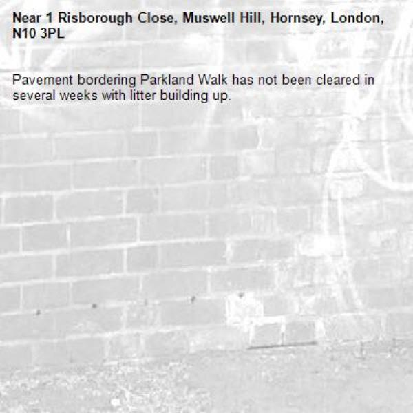 Pavement bordering Parkland Walk has not been cleared in several weeks with litter building up.