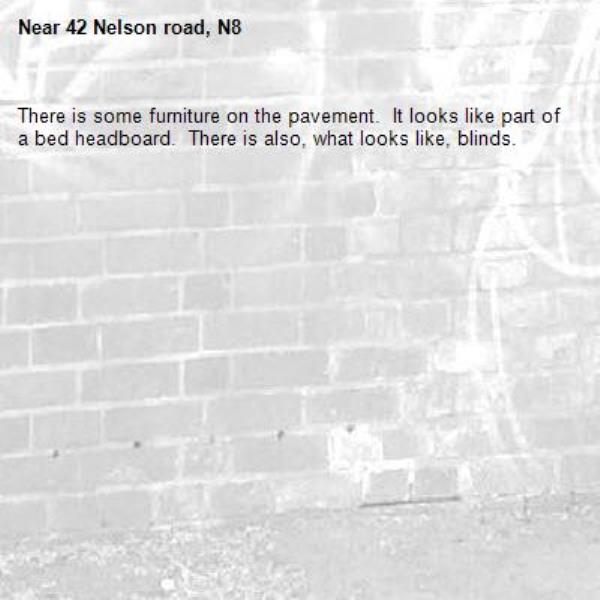 There is some furniture on the pavement. It looks like part of a bed headboard. There is also, what looks like, blinds.