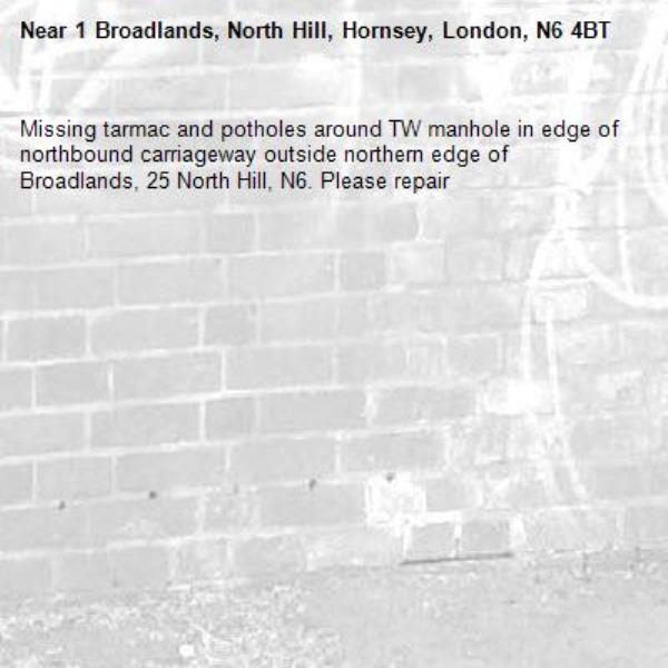 Missing tarmac and potholes around TW manhole in edge of northbound carriageway outside northern edge of Broadlands, 25 North Hill, N6. Please repair