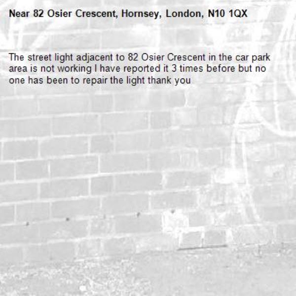 The street light adjacent to 82 Osier Crescent in the car park area is not working I have reported it 3 times before but no one has been to repair the light thank you