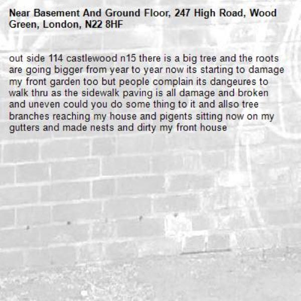 out side 114 castlewood n15 there is a big tree and the roots are going bigger from year to year now its starting to damage my front garden too but people complain its dangeures to walk thru as the sidewalk paving is all damage and broken and uneven could you do some thing to it and allso tree branches reaching my house and pigents sitting now on my gutters and made nests and dirty my front house
