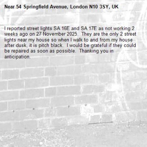I reported street lights SA 16E and SA 17E as not working 2 weeks ago on 27 November 2025. They are the only 2 street lights near my house so when I walk to and from my house after dusk, it is pitch black. I would be grateful if they could be repaired as soon as possible. Thanking you in anticipation.
