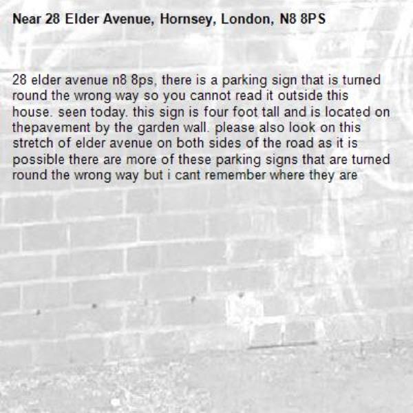 28 elder avenue n8 8ps, there is a parking sign that is turned round the wrong way so you cannot read it outside this house. seen today. this sign is four foot tall and is located on thepavement by the garden wall. please also look on this stretch of elder avenue on both sides of the road as it is possible there are more of these parking signs that are turned round the wrong way but i cant remember where they are