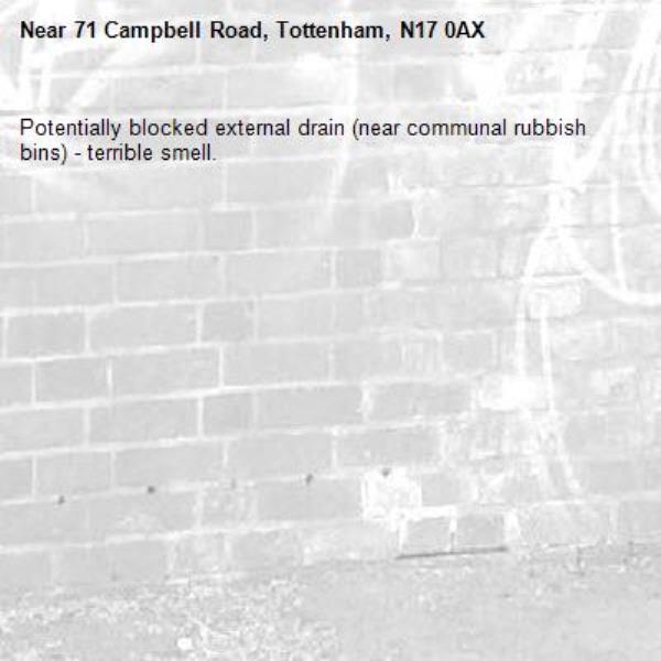 Potentially blocked external drain (near communal rubbish bins) - terrible smell.