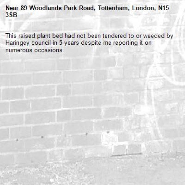This raised plant bed had not been tendered to or weeded by Haringey council in 5 years despite me reporting it on numerous occasions.