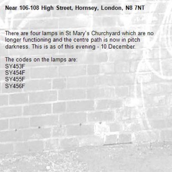 There are four lamps in St Mary's Churchyard which are no longer functioning and the centre path is now in pitch darkness. This is as of this evening - 10 December.