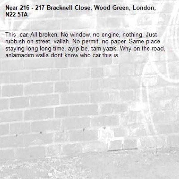 This car. All broken. No window, no engine, nothing. Just rubbish on street, vallah. No permit, no paper. Same place staying long long time, ayıp be, tam yazık. Why on the road, anlamadım walla.dont know who car this is.