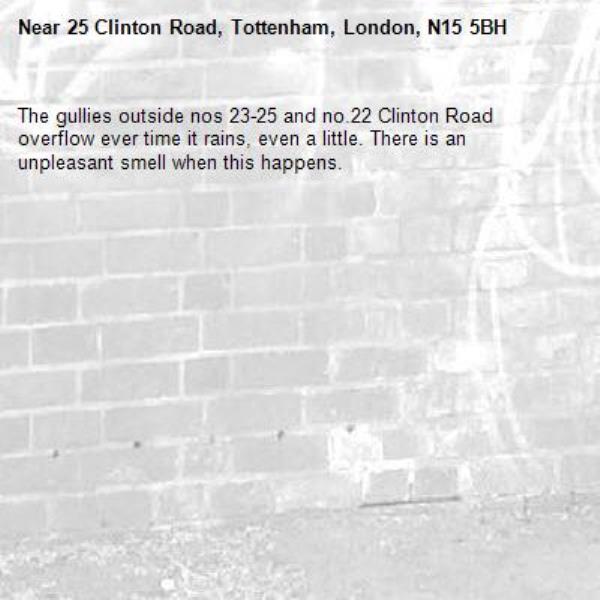 The gullies outside nos 23-25 and no.22 Clinton Road overflow ever time it rains, even a little. There is an unpleasant smell when this happens.