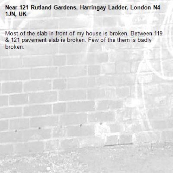 Most of the slab in front of my house is broken. Between 119 & 121 pavement slab is broken. Few of the them is badly broken.