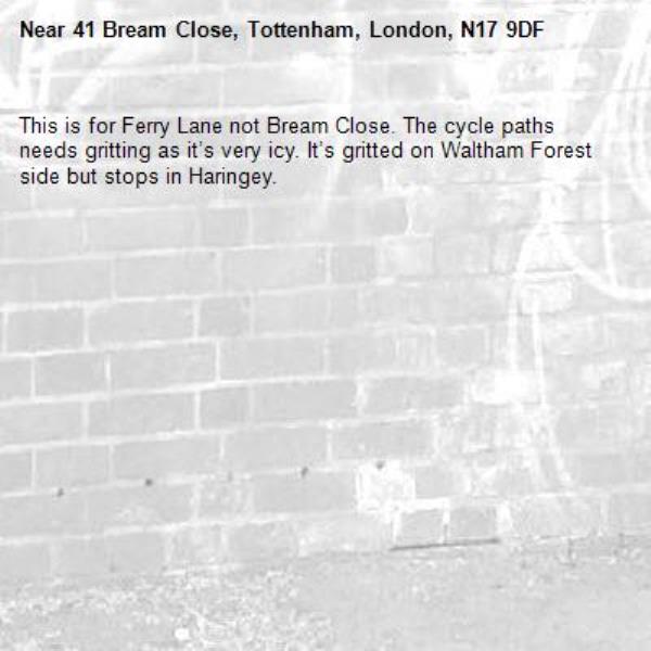 This is for Ferry Lane not Bream Close. The cycle paths needs gritting as it’s very icy. It’s gritted on Waltham Forest side but stops in Haringey.