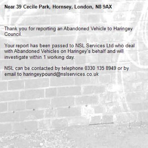 abandoned car parked in the residents parking bays in the road outside the houses at 37 to 39 Cecile park, crouch end, n8 9AX .car parked outside 39 cecile park to be exact. the car has a yellow coloured wheel clamp on it. on the window of the car is a notice which states this " warning of immobalisation clamped on 30/10/25 phone the enforcement agency called CDER group on tel 077733 1923337 to get information about this car. seen car here this week.