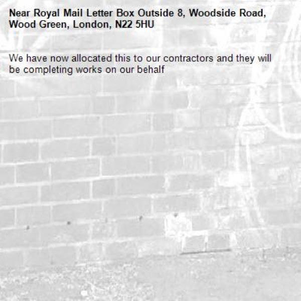 We have now allocated this to our contractors and they will be completing works on our behalf-Royal Mail Letter Box Outside 8, Woodside Road, Wood Green, London, N22 5HU 15/04/2026 10:22 We have now allocated this to our contractors and they will be completing works on our behalf