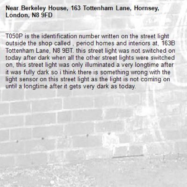 T050P is the identification number written on the street light outside the shop called , period homes and interiors at, 163B Tottenham Lane, N8 9BT. this street light was not switched on today after dark when all the other street lights were switched on, this street light was only illuminated a very longtime after it was fully dark so i think there is something wrong with the light sensor on this street light as the light is not coming on until a longtime after it gets very dark as today.