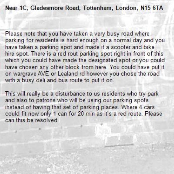 Please note that you have taken a very busy road where parking for residents is hard enough on a normal day and you have taken a parking spot and made it a scooter and bike hire spot. There is a red rout parking spot right in front of this which you could have made the designated spot or you could have chosen any other block from here. You could have put it on wargrave AVE or Lealand rd however you chose the road with a busy deli and bus route to put it on. <br/><br/>This will really be a disturbance to us residents who try park and also to patrons who will be using our parking spots instead of having that set of parking places. Where 4 cars could fit now only 1 can for 20 min as it's a red route. Please can this be resolved.