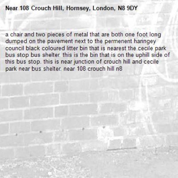 a chair and two pieces of metal that are both one foot long dumped on the pavement next to the permenent haringey council black coloured litter bin that is nearest the cecile park bus stop bus shelter. this is the bin that is on the uphill side of this bus stop. this is near junction of crouch hill and cecile park near bus shelter. near 108 crouch hill n8