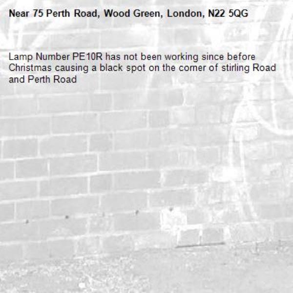 Lamp Number PE10R has not been working since before Christmas causing a black spot on the corner of stirling Road and Perth Road