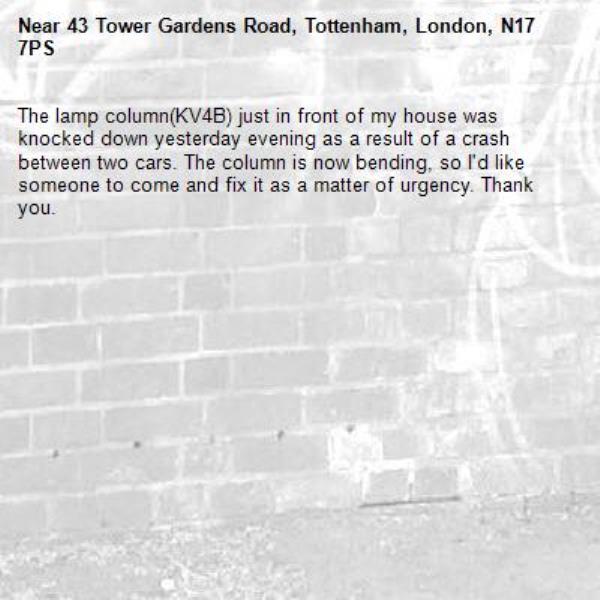 The lamp column(KV4B) just in front of my house was knocked down yesterday evening as a result of a crash between two cars. The column is now bending, so I'd like someone to come and fix it as a matter of urgency. Thank you.